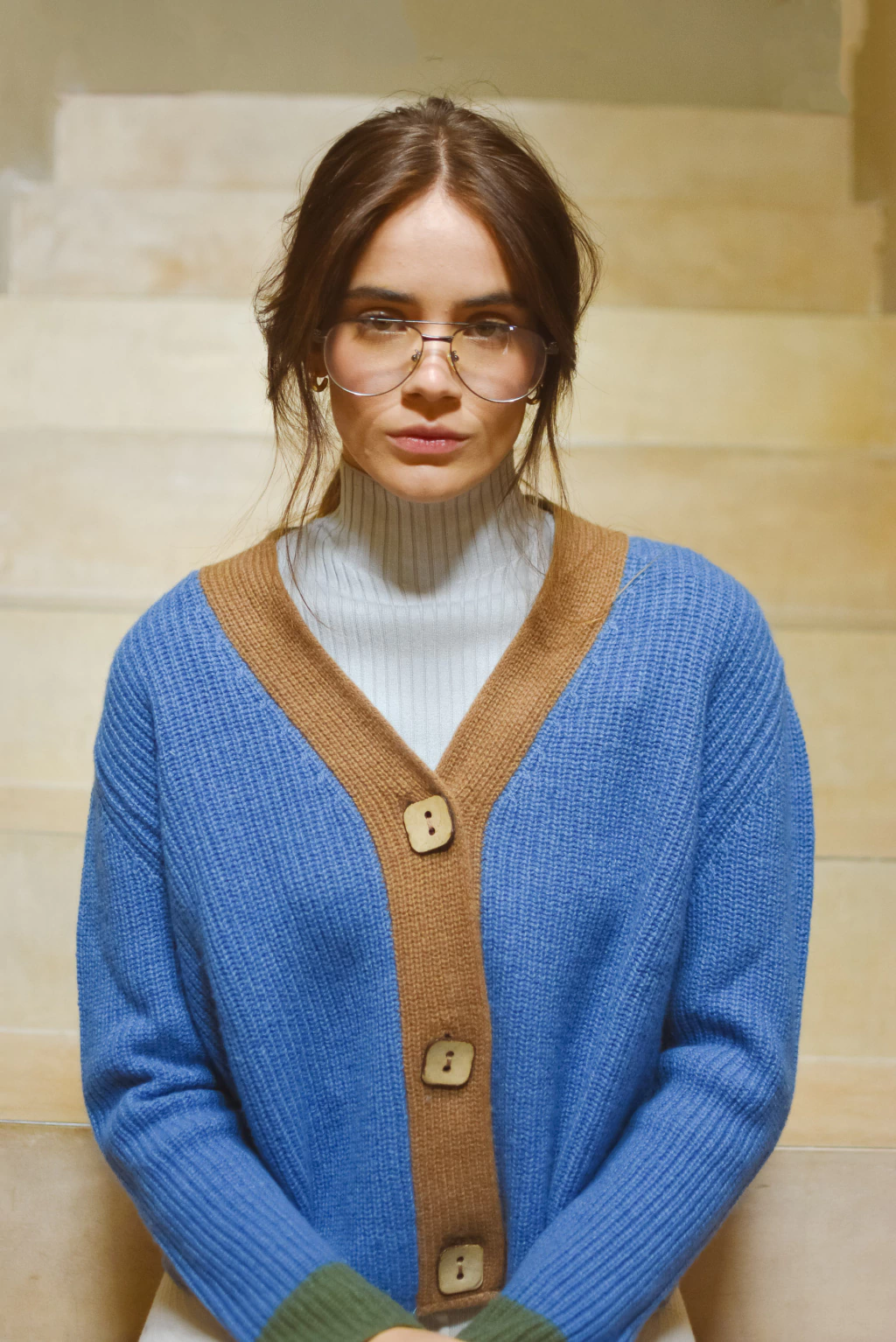 El cardigan Potrillo con un juego de colores y botones de coco extra large, le dan carácter y frescura a caulquier look. Ideal para usar como abrigo liviano o directamente sobre piel para un look mas sensual.