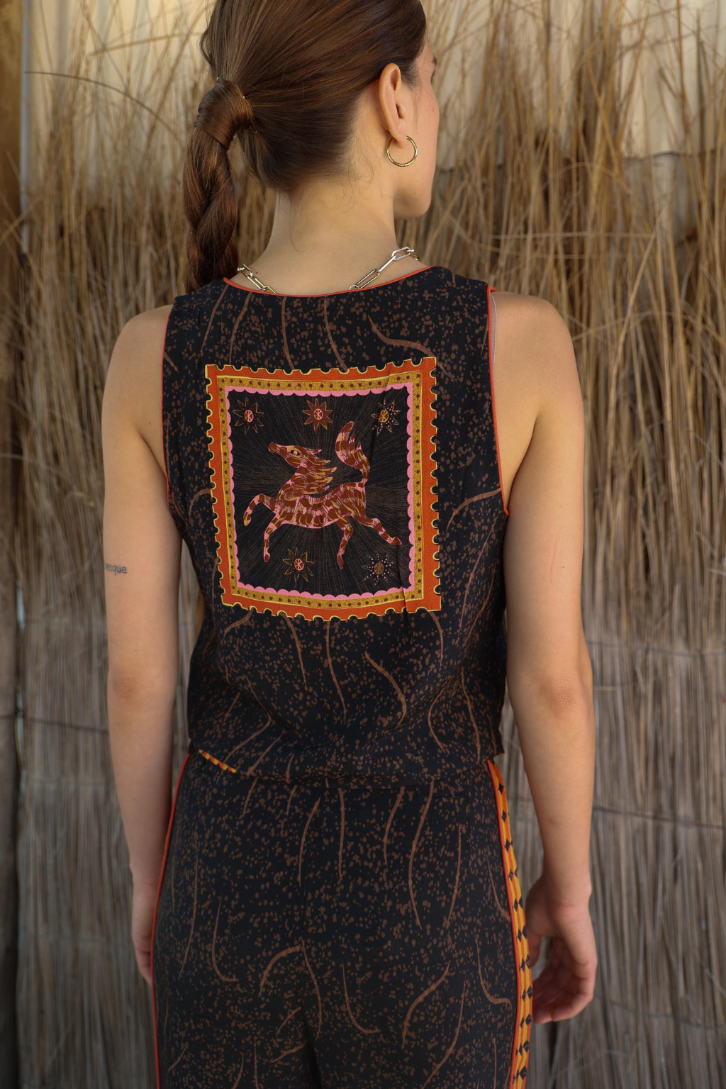 El Chaleco Paraiso, de viscosa crepe, un tejido ligero y cómodo, con estampa única del universo AE. Combinalo con el Pantalón Paraiso y tenes el dúo elegante y auténtico para cualquier ocasión.