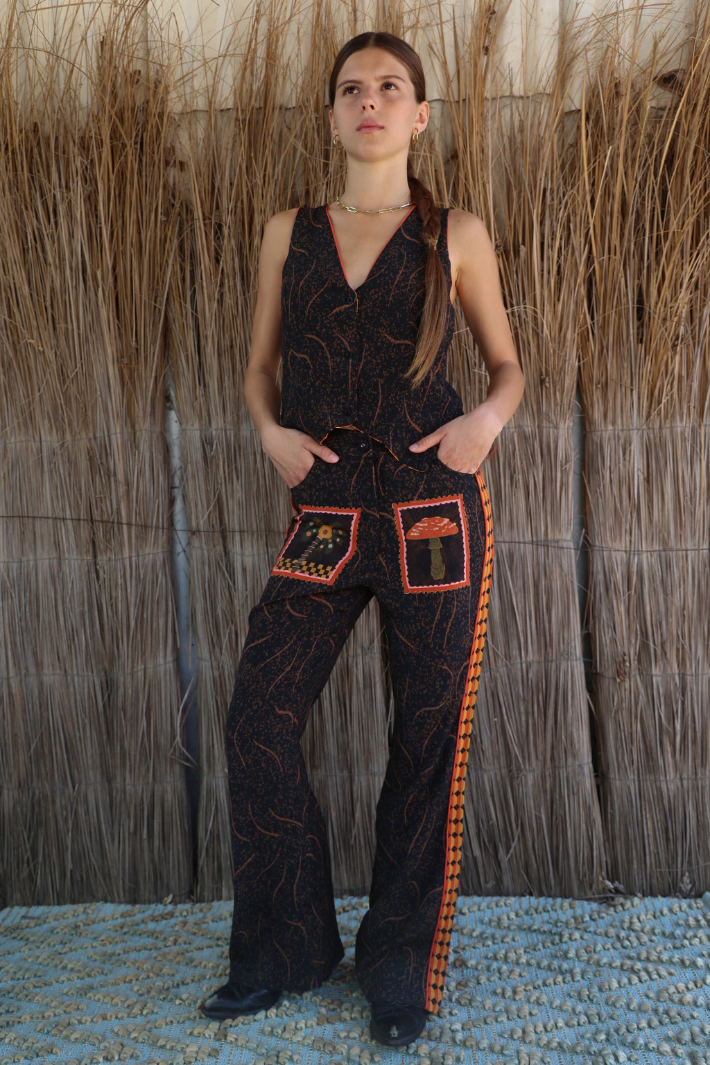 El Pantalón Paraiso de crepé viscosa, un tejido cómodo, fluido y ligero. De corte semi-oxford con una caída suave. Tiene una estampa creada para esta temporada con colores y texturas clásicas de AE. Es un pantalón versátil que lo podes usar para cualquier ocasión y si quieres un look completo autentico de AE, combinalo con el chaleco Paraiso.