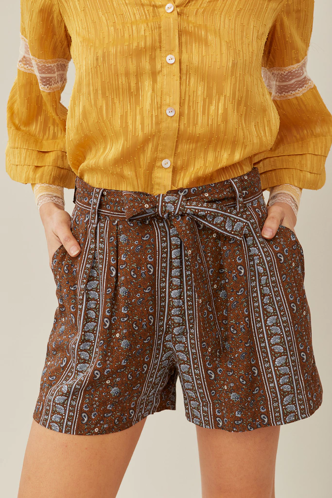 Short de viscosa estampada tiro alto, con bolsillos laterales. Posee un lazo de la misma tela para atar en cintura. Tiene galón a modo de vivo en laterales. Ideal para combinar con la camisa Ciprés.