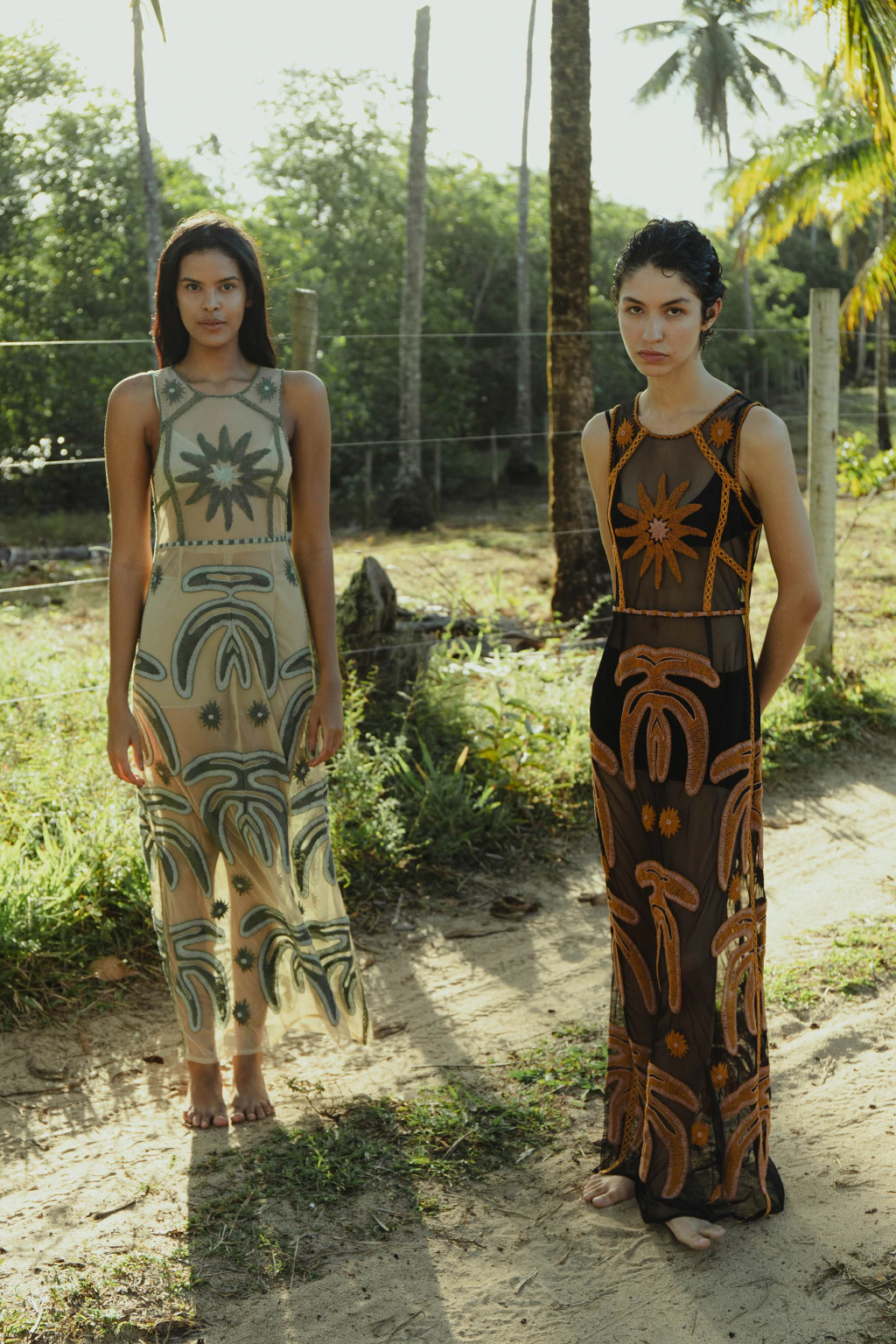 Esta colección es raíz y horizonte: mares, sierras, viento y salitre que se encuentran en prendas bordadas, flecos en movimiento y estampas que respiran fuerza.
